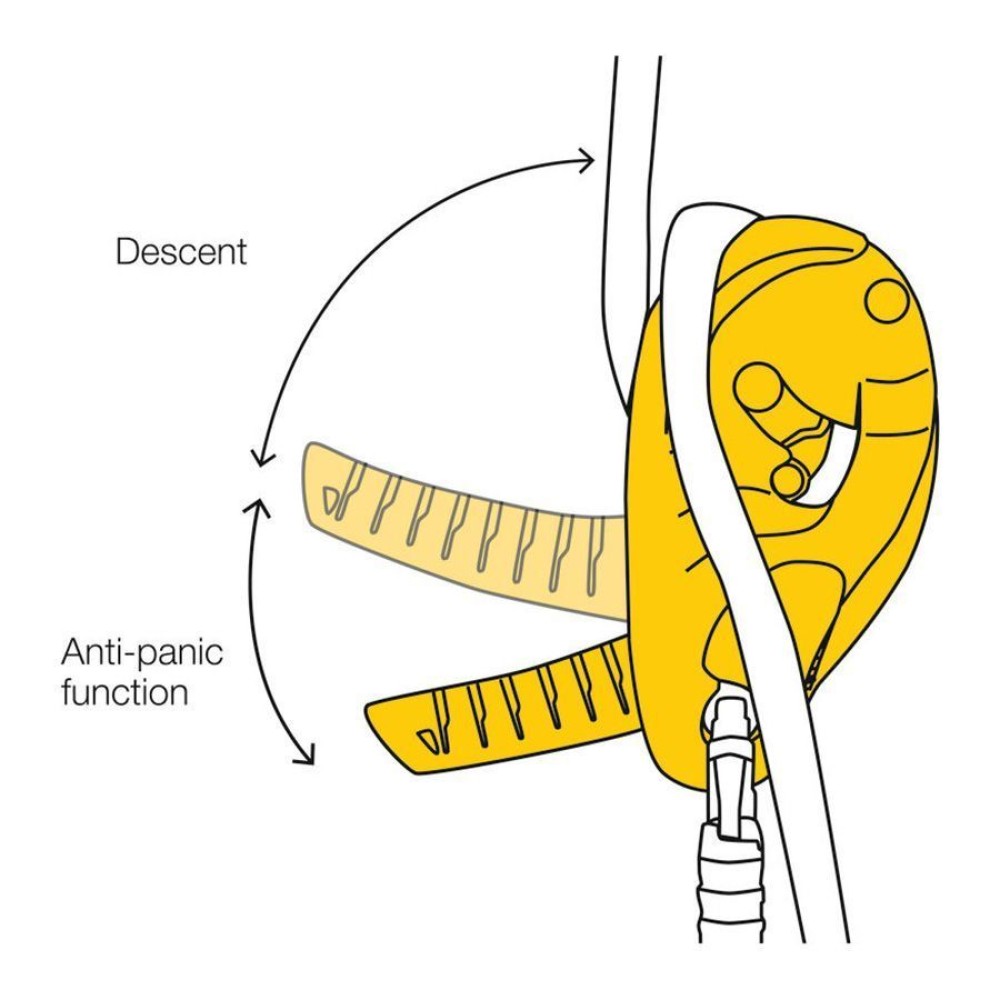 - Ручка автоматически переключается в положение хранения, когда веревка извлекается из устройства, уменьшая риск случайного зацепления при ношении спускового устройства на обвязке