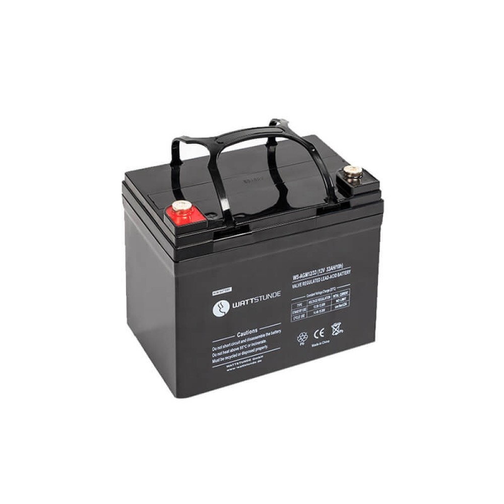 The WATTSTUNDE 12-33 12V AGM battery 33Ah C20 is a valve controlled and maintenance-free VRLA battery. The electrolyte is bound in a fiberglass mat (AGM = Absorbent Glass MAT) so that virtually no gas formation occurs. This also makes use possible in closed spaces or in the vicinity of people. Another advantage of the AGM technology: due to the leak resistance, it is possible to install the battery in every possible position (not just horizontally), thus guaranteeing the highest installation flexibility.